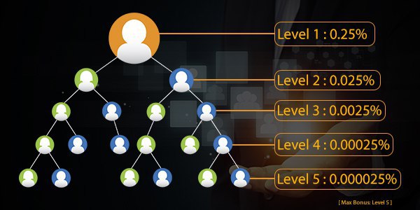 Referral Partner dapat memiliki ratusan bahkan ribuan downline referensi dengan maksimal downline TIDAK TERBATAS di setiap levelnya (Gambar 1) dengan kedalaman hingga 5 tingkat kebawah (Gambar 2)
